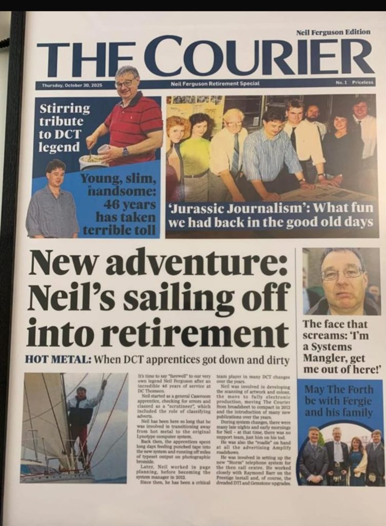 As Monifieth & District Rotarian Neil Ferguson retires after a 46 year career with DC Thomson, the company responded with this wonderful mocked up front page. Enjoy!