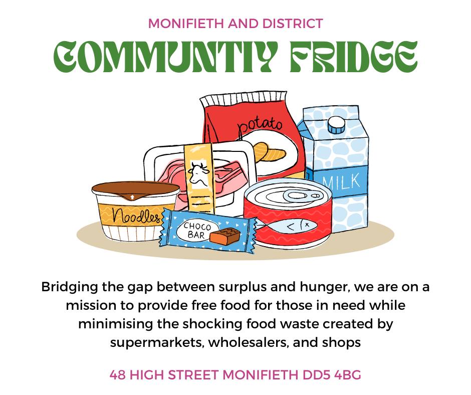 The Fridge is a joint community venture with a number of organisations across Monifieth district which, with support of local supermarkets, aims to cut down on food waste. It’s not a “food bank” but a “stop food waste” project.  More information can be found on their Facebook page HERE.