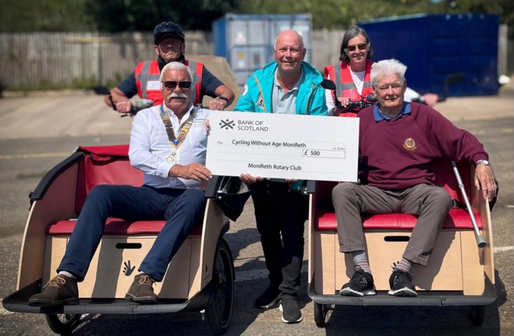 The club donated £500 to support Monifieth Trishaws. This will go a long way to helping with their next purchase – a Trishaw which can support a wheelchair and user! The Trishaws provide a wonderful service to older people in Monifieth who are unable to het out as much as they once did by taking them on cycle rides around the town and along the beachfront. Pictured are Past President Brian Cunningham with Trishaws’ Euan Williamson and our Community Convenor Ally Martin.